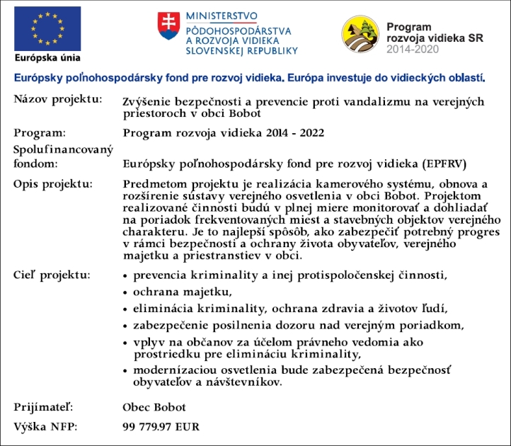 Názov projektu: Zvýšenie bezpečnosti a prevencie proti vandalizmu na verejných priestoroch v obci Bobot