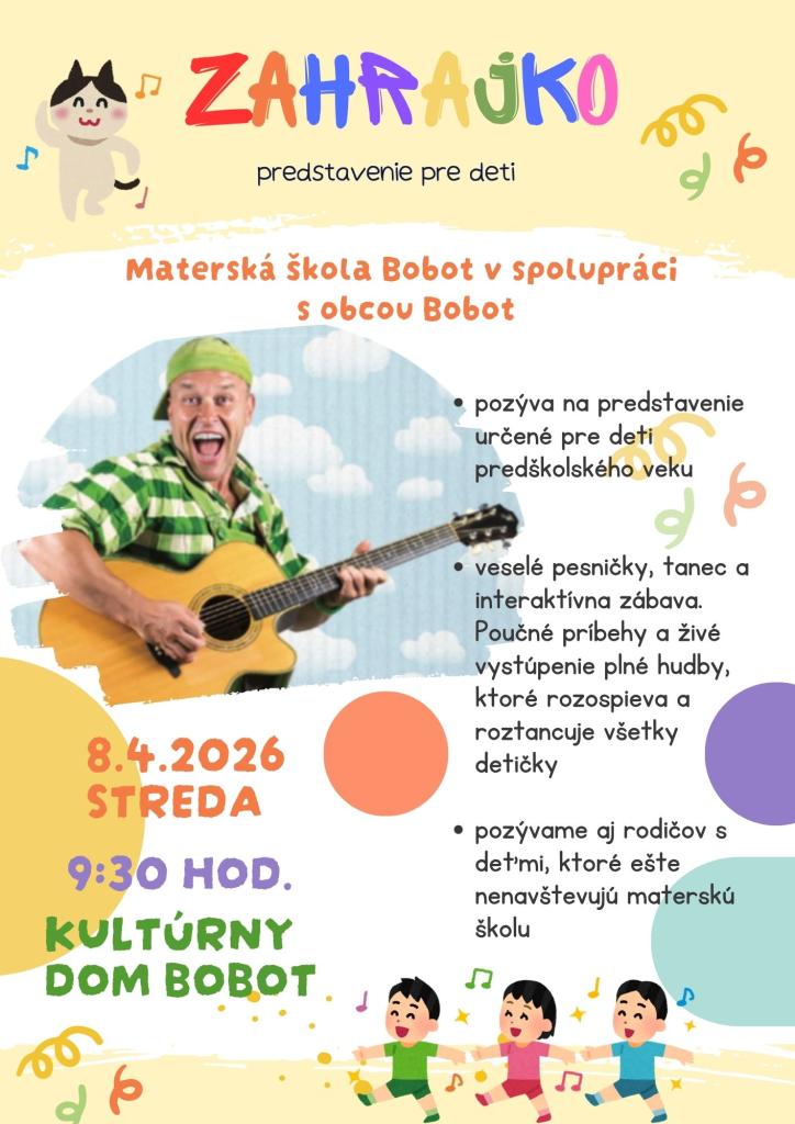 Veselé pesničky, tanec a interaktívna zábava. Poučné príbehy a živé vystúpenie plné hudby, ktoré rozospieva a roztancuje všetky detičky.