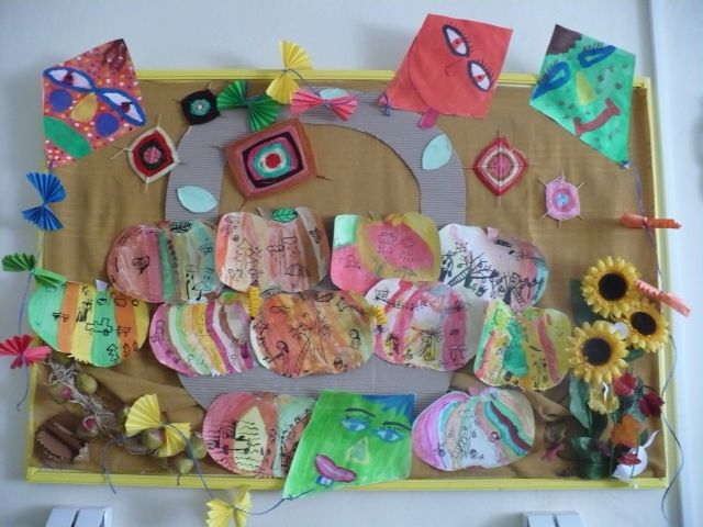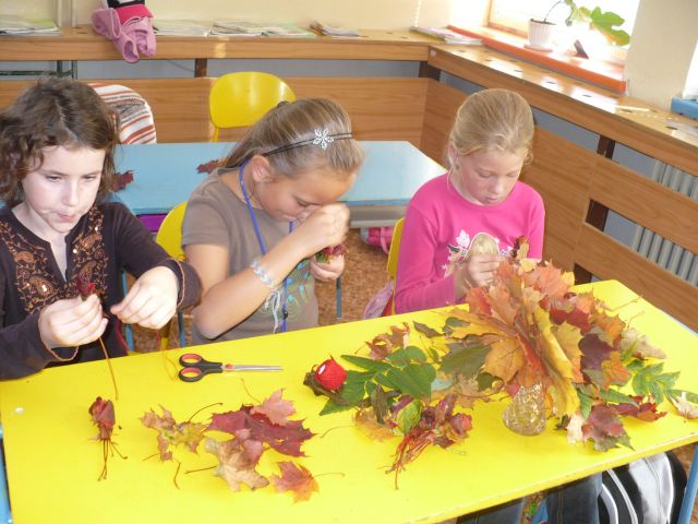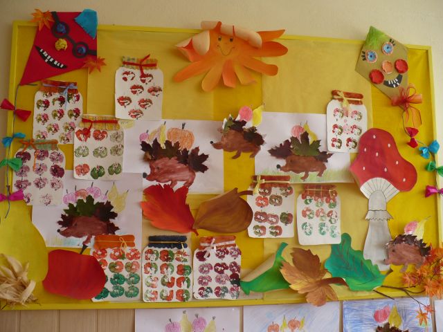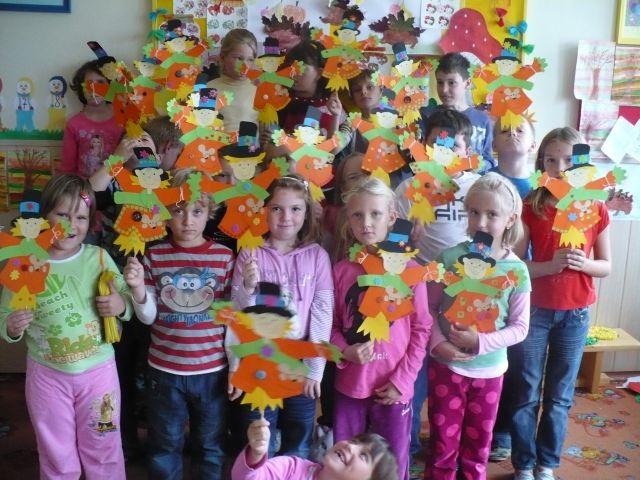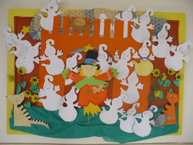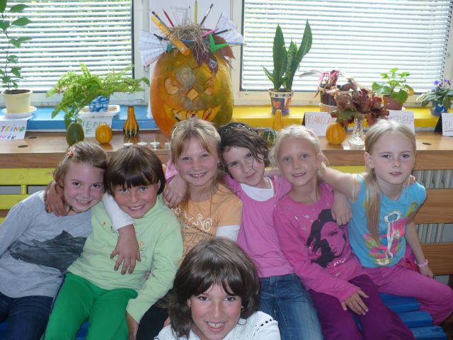 Jeseň je tu. (Tekvicové a papierové strašidielka, zvieratká z gaštanov, ovocie a zelenina, to všetko v týchto jesenných dňoch skrášľuje priestory základnej školy.)