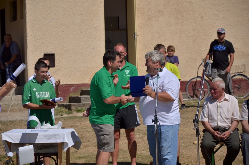 Predseda TJ Tatran Bobot pán Miroslav Sokolík preberá ocenenie od starostu obce pána Ľubomíra Tunegu